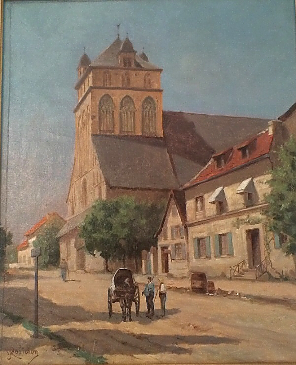 Jules Robichon toile, [date et sujet non déterminés] Connaissez-vous cette église ? On trouve dans la presse locale la trace de ventes de ses tableaux à la salle des ventes de la rue Grande-Fontaine à St-Germain-en-Laye où à son domicile : Vente volontaire aux enchères publiques au Vésinet, rue de la Mairie, 35, le dimanche 5 Août 1888, à une heures, par le ministère de Me Besnier, huissier-priseur de 100 tableaux tels que : Paysages des environs du Vésinet, Natures mortes, Tableaux de genre. Vieilles faïences de Delft et plats anciens, beaux bronzes et objets divers. Le tout composant la collection de M. Robichon, artiste-peintre, exposant au Salon. Au comptant, 10% en sus. [7] Certaines natures mortes peintes au Vésinet entre 1876 et 1890 pourraient avoir pour sujets des objets de la collection de la famille Willet qui, à l'époque, conservaient dans leur villa du Vésinet une partie de leurs collections et entretenaient avec les artistes locaux, des relations amicales. On ne trouve pas, cependant, d'œuvres de Robichon dans les fonds du Musée Willet-Holthuysen.