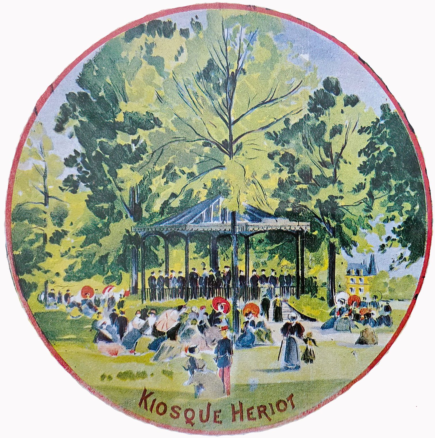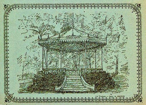 Dessin représentant le kiosque à musique utilisé sur les affiches annonçant les concerts et les programmes distribués aux spectateurs. Pour terminer la série des toasts un membre exécutant de « la Concorde » a porté la santé de M. de Migl, l'artiste grâce au talent duquel une reproduction du kiosque a pu être faite en tête des programmes du concert et grâce auquel il a été ainsi permis d'emporter un souvenir de cette fête. Les heures agréables passent toujours trop vite et pendant que l'on fraternisait, le moment de la séparation approchait. A 9 heures, la « Sparnonienne » quittait le Vésinet et le train partant, on se souhaitait de part et d'autre le plaisir d'une nouvelle entrevue. **** Notes et sources : [1] Le kiosque, installé à l'origine pour la cantatrice Rosine Stoltz dans sa propriété du Vésinet vers 1860, fut acquis par Auguste Hériot en 1874. Le Commandant Hériot, frère et héritier du précédent, en devint propriétaire en 1879 et en fit don à la fanfare qu'il avait créée au Vésinet (1890). Par la suite, le maire Alphonse Ledru en disposa comme un d'bien communal, ce qui fut durant plusieurs années un sujet de discorde. [2] Tout en inaugurant le kiosque, on fêtait aussi la nomination de M. Hériot comme président d'honneur de la fanfare la « Concorde ». Les membres exécutants de cette Société sortaient pour la première fois avec leur uniforme : vareuse en drap noir avec boutons jaunes et une lyre de chaque côté du col ; casquette et cravate blanche que les musiciens avaient déjà. [3] Ce Kiosque à musique, édifié à l'entrée de la grande pelouse longeant l'allée d'Isly, face à la Gare du Vésinet, sera appelé communément le Kiosque Hériot. Accessible par un escalier de huit marches, de forme octogonale, ses colonnes sont en fonte. Sa toiture en zinc est bordée d'un lambrequin de bois découpé et son garde corps est orné de volutes en fer forgé ; il est entouré d'une plate bande de buissons. [4] Alphonse Joseph Ganne (1859-1932) employé de banque et musicien, était le frère de Louis Ganne, ancien chef d'orchestre du Nouveau Théâtre à Paris, et célèbre compositeur des Saltimbanques et de la Marche Lorraine. Avant 1890, Louis et Alphonse Ganne avaient fondé la société France-Fanfare dans le faubourg du Temple. Alphonse Ganne quittera Le Vésinet en 1894 pour fonder à Paris, l'Union Musicale de Montmartre (qui viendra occasionnellement jouer au Vésinet). [5] Les fanfares se succèderont au Vésinet, mais aucune ne perdurera longtemps. Après la Concorde, dissoute en 1899, ce sera la Fraternelle, fondée en 1891 et dirigée par A. Louis. Elle disparaît également peu après sa formation. En 1901, faute de musique, la municipalité est contrainte d'engager des phalanges extérieures à la commune pour assurer quelque peu les fêtes données sur le Kiosque Hériot. Ainsi, sont engagées tour à tour l'Union musicale du VIIIe arrondissement, la fanfare de Poissy puis la Fanfare Parisienne. En 1907 est constitué l'Accord Parfait, qui durera jusqu'en 1963. [6] Inutilisé à partir de 1914, laissé à l'abandon le kiosque Hériot fit, en 1932, l'objet d'un projet de restauration qui n'eut pas de suite. la superstructure fut démontée en 1934 et le socle maçonné démoli à la fin des années 1960. [7] En 1999, une association « Pour un Kiosque au Vésinet » lança une campagne pour réinstaller un kiosque à musique au Vésinet « dans le cadre des festivités de l'An 2000 » qui n'aboutit pas.