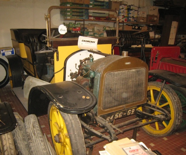 La dernière voiture Chameroy (Collection Broual) Le chassis est bon et d'origine, il apparaît complet avec ses particularités propre la marque ; la carrosserie a été refaite dans les années 1960. Elle fonctionnait encore dans les années 1990. Le moteur en place est borgne, c'est un 4 cylindres en v très étroit. Un moteur Aster monocylindre sera livré avec la voiture. © Mario Montanaro.