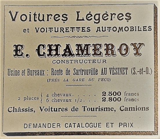 Les Automobiles Chameroy ont réussi à mettre au point un système original de boîte de vitesse à embrayage par courroie en ayant résolu la principale difficulté qui est celle de la tension. Même si le système Chameroy n'a pas fait école, il subsiste cet exemplaire, le seul connu, qui a bien fonctionné du temps du musée [3]. Remise en lumière à l'occasion du Salon Rétro Mobile, à Paris (7-11 février 2018), la voiture Chameroy a été proposée à la vente lors d'une vacation d'Artcurial le 10 février. Estimée à 10.000 - 15.000 €, elle a finalement été adjugée à 24.000 €. **** Notes et sources : [1] Le Vésinet, la revue n°6, juin 1997. [2] Hippolyte Chameroy, fondateur de l'entreprise, habitait au Vésinet, 89 avenue Centrale, actuelle avenue G.-Clemenceau. Son fils Emile, constructeur de l'automobile, habitait avec sa famille (Helen Stunnel sa femme d'origine anglaise et leur fille Yvonne née en 1906 au Vésinet) au 71bis, route de Montesson. Les ateliers et les bureaux étaient dits "route de Sartrouville, au Vésinet, près de la gare du Pecq" sans indication de numéro. Cependant, Pourtant dans les Archives commerciales de France, à la rubrique "Formation de Société anonyme" les Etablissements Emile GHAMEROY sont indiqués "route de Sartrouville, à Montesson" (1908). Nos recherches les situent au niveau des actuels numéros 71-73. [3] Aménagé dans un ancien four à chaux de la ville du célèbre pont-canal au-dessus de la Loire, on y découvrait des voitures bizarres, des constructeurs étranges et des cyclecars singuliers, à côté de voitures de grandes marques. Catalogue Rétromobile, 2018.