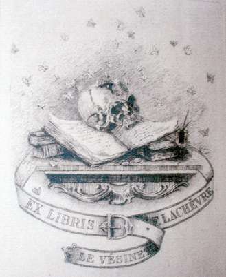 Le bel ex-libris macabre gravé à l'eau-forte, apposé ici sur un ouvrage du XVIIIe siècle, en reliure moderne: