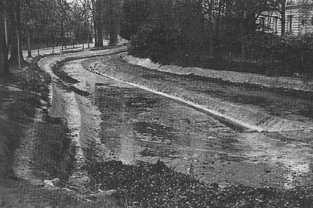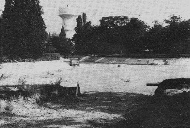 Lac de Croissy en travaux de réfection, automne-hiver 1969-70. Pourtant, les conclusions de la Ville relèvent des insuffisances et des retard : les 600 mètres de rivières prévus au contrat n'ont pas été rigoureusement atteints chaque année ; la SLEE est en retard en ce qui concerne le curage des lacs puisque seul le lac de Croissy et la moitié du Lac Inférieur ont été nettoyés en cinq ans. La Ville a donc demandé à la SLEE de veiller de façon plus rigoureuse au respect des clauses du contrat de concession et en particulier de prévoir au titre de l'année 1970 le curage et la réfection du bief de rivière situé entre le boulevard Carnot et la route de Croissy, bief qui est en très mauvais état. Il a également été demandé à la SLEE d'entreprendre la réfection du lac Supérieur pour lequel aucune périodicité n'a été prévue, mais qui n'a pas été curé depuis de très nombreuses années.