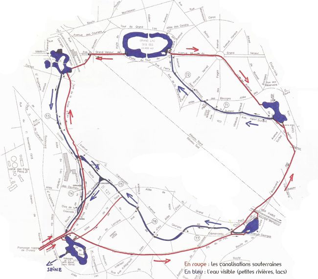 Schéma figurant le réseau hydraulique des lacs et rivières du Vésinet Réalisé pour l'exposition de 2011 "L'eau dans ma ville" en partenariat entre la Ville, la SHV, Suez-Environnement, Seine Vivante. [10]