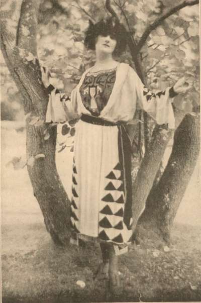 Cette robe d'après-midi montre les différentes façons dont une Parisienne peut porter de la broderie. La robe, en drap noir est ornée d'une broderie dessinant en blanc et noir un de ces écussons que les pages du Moyen-âge prêtent aux élégantes cet hiver. La tunique en crêpe Turco blanc agrémentée de triangles de velours bordés de perles et d'une matière qui rappelle la mousseline de soie sans en être.