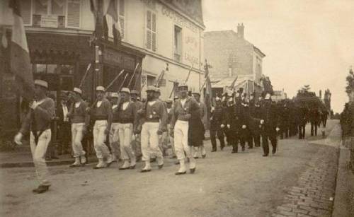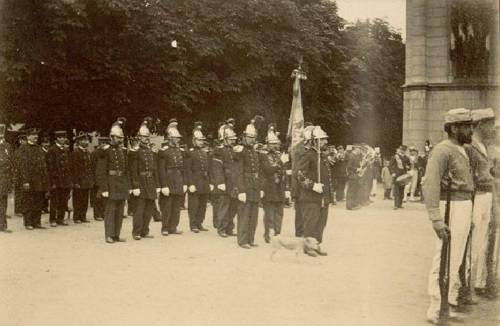 Les fêtes au Vésinet Défilé des sapeurs-pompiers dans la rue de l'Eglise (1890) © Archives départementales ...