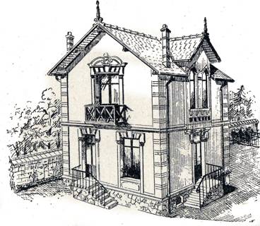 Maison - Bâtie sur une très grande parcelle, c'est l'oeuvre la plus importante de Gilbert au Vésinet et chacune de ses façades a fait l'objet d'une recherche particulière, sur le thème du "brique et pierre". L'élévation principale est flanquée de deux pavillons carrés, formule que l'on rencontre dans les maisons de caractère "moderne" dès les années 1870, couverts de flèches très élevées. A l'étage, les angles des pavillons sont coupés, procédé déjà rencontré au 1, rue du Marché. Le centre de la façade est marqué par un léger avant-corps amorti par une composition pyramidante autour d'une lucarne à baies géminées en plein cintre. On relève des accents véritablement maniéristes dans le mouvement du fronton et surtout dans la disposition des ailerons qui calent la composition. La façade postérieure, reprenant un schéma classique, s'enfle dans sa partie centrale d'un large avant-corps occupé par le grand salon. On note une excroissance de couvertures tout à fait étonnante. Les façades latérales, curieusement, présentent un pignon découvert là où l'on attendrait un toit brisé comme pour le reste l'édifice. Mais le pignon fait l'objet d'un traitement particulier. Interrompu par la corniche qui dessine une sorte de fronton, le décor, plus que jamais, emprunte à la Renaissance: souches de cheminées, lucarnes, culots.., jusqu'au motif de cordelière qui encadre le fronton.