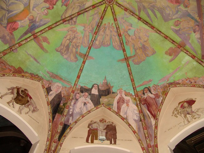 Maurice Denis – Chapelle du Sacré-Cœur. ... des séraphins accourent, battant de leurs ailes triomphales les nuages pleins de lueurs rouges, violacées, oranges ...[2] Comment dire ici, en quelques lignes, les vertus expressives et décoratives de cette œuvre! Elles sont excellemment énumérées dans la belle brochure : Maurice Denis au Vésinet, où le vaste et vivant esprit qu'est Adrien Mithouard et le critique fervent qu'est M. l'abbé Desfossés, ont commenté avec un lyrisme précis cette œuvre de piété et de beauté. Les auteurs y ont caractérisé « ces mystiques et discrètes images », ils ont indiqué comment elles respectent les lignes architecturales pour mieux les embellir, et comment la couleur de Denis, laiteuse, pure, si naturellement murale, s'est associée à merveille aux petites voûtes du Vésinet. Après un pèlerinage aux claires cellules de Saint-Marc, on peut désormais contempler une œuvre religieuse contemporaine dans les chapelles en fête de la pauvre église du Vésinet. **** Notes et sources: [1] Hippolyte Fierens-Gevaert (1870-1926). Historien de l'art, philosophe, critique d'art, chanteur et écrivain belge. Il fut le premier conservateur en chef des Musées royaux des beaux-arts de Belgique. [2] Les illustrations sont des photographies prises avant le sinistre du 26 juillet 2009 qui a gravement endommagé les peintures, en particulier celles de la chapelle du Sacré-Coeur qui n'a pu être complètement restaurée.