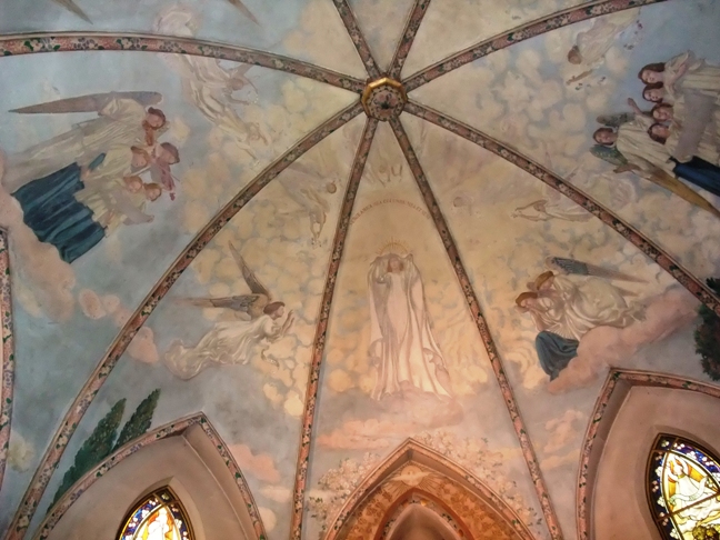 Maurice Denis – Chapelle de la Vierge. ... Marie, blanche de sa gloire immaculée, lève les bras et monte immatérielle ...[2] Un déambulatoire contourne le chœur ; des rosiers, des glycines, des pâquerettes semées sur champ d'or, transfigurent les petits piliers aussi tristes jadis que ceux de la nef. Cette allée florale mène à l'autre chapelle : celle du Sacré-Cœur. Une atmosphère de flammes tendres nous y enveloppe. Jésus est debout au centre de la voûte, la tête inclinée par l'infinie miséricorde, les bras ouverts ; son Cœur, visible, rayonne dans sa poitrine comme le soleil de toutes choses, et à travers cette lumière répandue jusqu'aux confins du monde, les séraphins accourent, battant de leurs ailes triomphales les nuages pleins de lueurs rouges, violacées, oranges, — lueurs de joie, de victoire, de sacrifice, où surgissent en masses lointaines les grandes basiliques de France... Et trois vitraux, ici encore, montrent Jésus guérissant les malades, Jésus pardonnant à la pécheresse, Jésus distribuant l'Eucharistie. D'autres scènes remplissent des tympans; des figurations symboliques animent les consoles; et partout, dans les cadres, sur les nervures, des rosiers saignent sur de l'or...