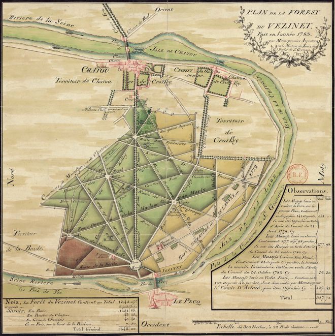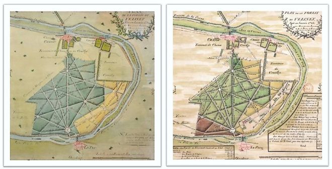 Plan(s) de la forest du Vezinet fait(s) en l'année 1780 (1783) par Main, premier arpenteur en la Maîtrise des Eaux et Forest de St Germain (reproductions offset des dessins originaux). Le premier plan daté de 1780 fut surtout recherché pour son caractère esthétique. Il avait pourtant comme première raison d'être la représentation des travaux mis en chantier après l'Arrest du conseil d'Etat au Roy du 25 octobre 1780 suivant lequel les parties de bois (lavées en jaune sur le plan) ont été recépées.