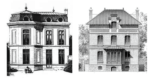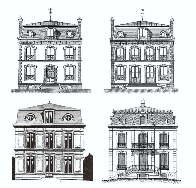 Différents modèles de « maisons de campagnes » proposées par les architectes sur catalogue. (ici Bertrand, Picard, Petit, Agnès) Les styles « néo-Louis XIII » et « néo-classique » sont les plus répandus.