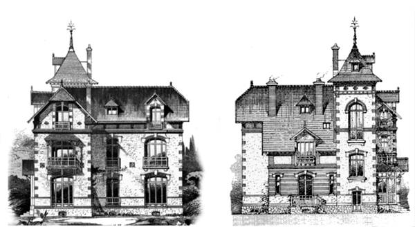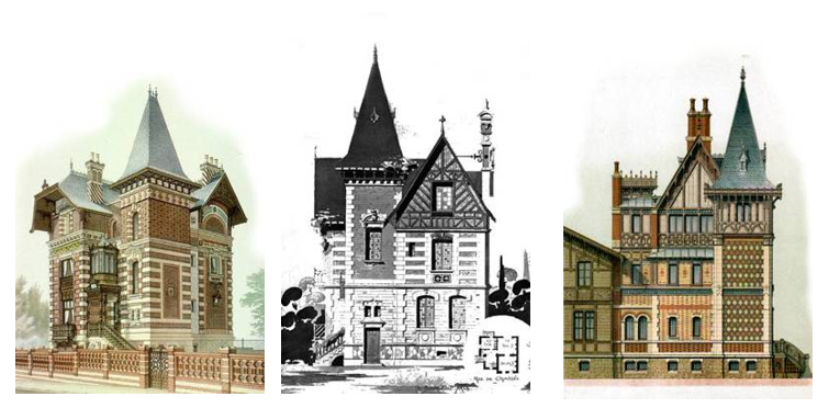 A côté de ces maisons conventionnelles, très semblables, l'éclectisme caractérise aussi des édifices beaucoup plus originaux, des « folies » aux allures de château médiéval pour lesquels les architectes (ici Saingery, Bourgeois, Bardon) laissent libre cours à leur fantaisie. Pourtant, la pierre, la brique polychrome, les faïences, le soubassement de meulière les intègrent à cette « identité vésigondine » des premières années.