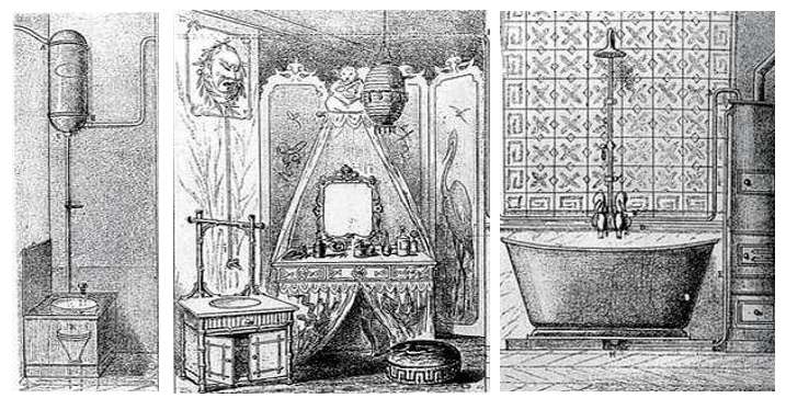 « Toute habitation n'a qu'à tourner un robinet pour avoir, à toute heure, autant d'eau qu'il lui plait... » note le chroniqueur enthousiaste. Disposer de l'eau courante à tous les étages, c'est un « luxe » offert par la Cie des Eaux et Terrains du Vésinet [3]. Une opportunité que les habitants et les architectes ne saisissent pas toujours. Ce n'est pas qu'une question d'argent. Si les salles de bains, les douches et des toilettes intérieures n'apparaissent pas dans la majorité des demeures, comme l'examen des actes de vente a permis de l'observer, il est intéressant de noter qu'elles sont tout de même présentes là plus qu'ailleurs. [4] Pendant les deux dernières décennies du XIXe siècle, les recueils de plans d’habitations présentent des appartements équipés selon un habitus qui dissocie coquetterie et beauté de propreté et hygiène. À la première exigence correspond le cabinet de toilette, à la seconde, la salle de bains. Si à la fin de la période étudiée les pratiques et les lieux se sont transformés, cette évolution ne touche pas de la même façon tous les groupes sociaux. La France rurale continue de faire sa toilette le dimanche, dans une cuvette et avec très peu de cette eau qui nécessite de grands efforts pour être tirée du puits. Les ouvriers sont sommés d’utiliser les douches qu’on leur destine mais vont lentement dissocier cette injonction et le plaisir de l’eau. La France urbaine et bourgeoise est prête à accepter la propreté blanche et brillante des salles de bains-laboratoires qu’elle avait refusées à l’Exposition universelle de 1900. Jusqu'au début du XXème siècle, une somptueuse demeure pouvait s'enorgueillir d'une salle de bain et de cabinets d'aisance. La salle de bain est encore exceptionnelle à l'époque ; le plus souvent un cabinet de toilette sans eau courante, suffit. En 1902, les cabinets d'aisance sont une curiosité que l'on ne trouve, en France, que dans un logement sur trois. [6]