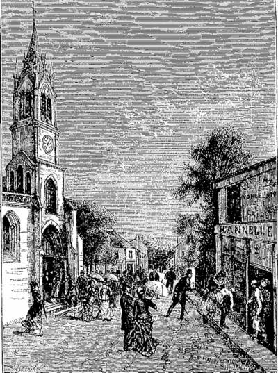 L'homme au plaid, suivant la foule, arriva bientôt sur la place de l'Eglise. Elle est charmante, cette petite église du Vésinet, toute blanche, au milieu d'une place plantée d'arbres. Le mystérieux étranger devait être absorbé par de graves préoccupations pour passer devant elle sans paraître la remarquer. On commençait à sortir de la grand-messe, et toute l'attention de notre homme, debout au coin de la rue Thiers, se portait sur les personnes qui descendaient les degrés.