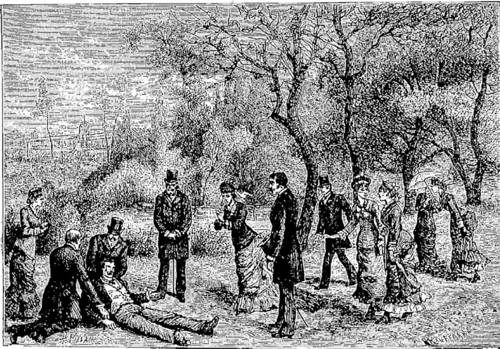 Les dames avaient, de la terrasse, assisté à cet horrible spectacle. En moins de temps qu'il n'en faut pour l'écrire elles furent auprès du blessé. Richard et de nombreux témoins de l'accident y arrivèrent presque en même temps qu'elles, et un médecin qui se trouvait parmi les assistants donna les premiers soins à Mr Smith.