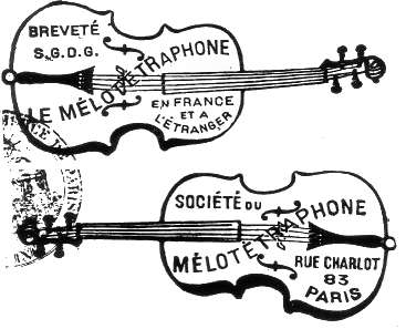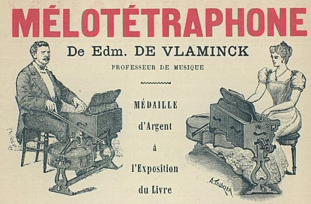 Société du Mélotétraphone, 1893. Dessin de marque représentant deux violons posés horizontalement sur leurs éclisses. MM. E. Michel et B. Thieck apportaient une somme de quinze cents francs chacun. L'apport de M. de Vlaminck consistait dans ses brevets et dans la surveillance qu’il devra donner à la fabrication des appareils en y apportant le temps nécessaire, ses soins, ses connaissances spéciales, les documents nécessaires à la fabrication, comprenant notamment les indications et secrets pour la parfaite mise en mouvement des appareils sur les appareils à cordes respectifs. Cet apport était évalué trois mille francs. Société du Mélotétraphone, Paris, 83 rue Charlot. Voici qui se distingue des étrennes ordinaires. C'est une curieuse et intéressante innovation qui s'adresse à tous les amateurs de musique et plus particulièrement aux dames et aux familles. Le Mélotétraphone tel est le nom de cet instrument nouveau, a donné au Figaro une audition qui a émerveillé toutes les personnes présentes. Ce n'est point, disons-le franchement, pour les concerts, ni pour les orchestres de nos grands théâtres qu'a été créé le Mélotétraphone. On y exige des virtuoses rompus au métier et qui n'ont besoin d'aucune aide. Pour les amateurs, au contraire, pour les familles où l'on aime à faire entre soi de la bonne musique, quelles ressources offre cette ingénieuse innovation ! Les difficultés du doigté des instruments à cordes, et notamment du violoncelle, sont connues. Il faut de longues années d'études pour arriver à être d'une force moyenne. Avec le Mélotétraphone, au contraire, on peut en quelques jours connaître le doigté du petit clavier.