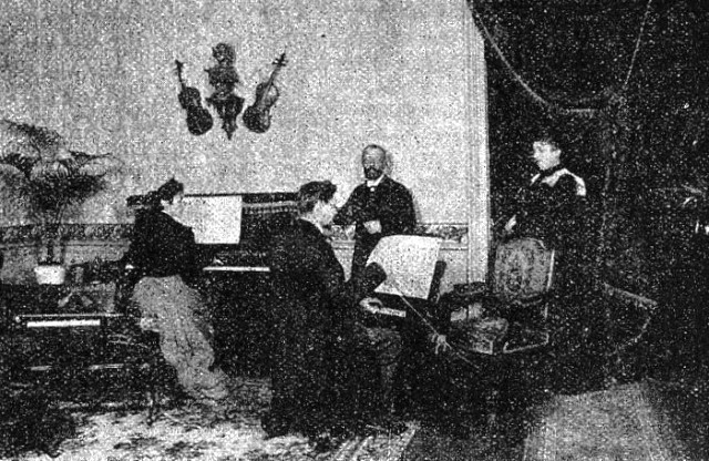 [ Salon d'audition de la Société du Mélotétraphone, 83, rue Charlot, Paris. Illustration de l'article du Figaro (reprise dans La Vie Parisienne).