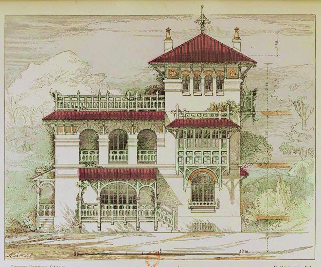 D'après Émile Rivoalen (1843-1912) dans Petites maisons modernes de ville et de campagne (Georges Fanchon éd., Paris, 1901). La Villa Miraflores au Vésinet (Seine-et-Oise) Incluse dès 1992 dans les demeures à protéger du Plan d'Occupation des Sols de 1992, la villa Miraflores eut droit à un paragraphe et une belle illustration dans l'ouvrage de référence : Le Vésinet, modèle français d'urbanisme paysager (1858-1930), Cahier de l'inventaire n°17, Imprimerie Nationale, Paris, 1989 réalisé à partir de l'inventaire du ministère de la Culture en 1980-86.[2] … Cette petite maison de plaisance a été récemment bâtie, pour le compte de M. de Y..., Américain du Sud [3], dans le site assez plat, mais agréablement boisé, que couronne la Seine et que dominent les coteaux de Saint-Germain, de Marly, de Louveciennes. C'est dire qu'on ne pouvait ici manquer - tant au point de vue du site environnant que pour satisfaire au vœu du client d'outre-mer - à la presque obligation de créer quelque chose d'original et mouvementé. Autant il parait rationnel, en pays de montagnes, d'étaler l'habitation presque de plain-pied, sous l'abri d'une vaste couverture dont l'égout descendrait, par les côtés exposés aux bourrasques, presqu'à terre ; autant il semble agréable, en plaine, de surélever au contraire, certaines parties de l'habitation ; de dresser tourelle ronde ou carrée, campanile ou clocheton ; et cela pour briser, à l'œil du passant, la monotonie du plan horizontal, de l'assiette environnante ; pour faciliter aux habitants la vue des lointains paysages. La villa « Miraflores » détache ses riantes façades blanches, émaillées de floraisons grimpantes, sur le rideau vert des taillis du Vésinet.