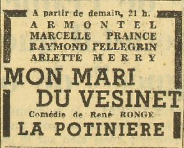 Le Vésinet au théâtre, SHV, 2020. Mon mari du Vésinet Comédie-vaudeville en trois actes Après dix mois de succès, Les Maîtres-nageurs, comédie satirique de Marcel Franck, allaient quitter l'affiche. Et c'était « une farce 1900 » de René Rongé intitulée Mon Mari du Vésinet qui lui succèderait sur la scène du Théâtre de la Potinière à partir du 20 avril 1950. Son auteur, comédien belge alors pensionnaire du Gymnase de Liège depuis 15 ans et professeur au Conservatoire de cette ville, avait écrit sept comédies, toutes inédites à Paris. Une programmation risquée pour la directrice de ce théâtre abonné aux pièces dites de Boulevard. Avec quelques semaines d'avance, l'annonce précisait que « L'action de Mon mari du Vésinet a pour décors la boutique d'un oiseleur. La pièce retrace les mésaventures comiques d'un jeune homme qui se découvre marié malgré lui par suite d'une erreur d'un employé de l'état civil ». Armontel incarnera ce malheureux, Edna Damasco sera sa pseudo épouse, tandis que Martine de Breteuil (la directrice du théâtre) jouera (à contre-emploi) les ingénues perverses, aux côtés de Raymond Pellegrin, Yolande Laffon, Madeleine Subbel, Willie Rey, etc. [1] Edna Damasco (brésilienne présentée comme la nouvelle Elvire Popesco) malade a finalement laissé sa place à Arlette Merry (Arlette Pinoteau, sœur du cinéaste Claude Pinoteau).