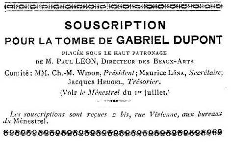 Souscription pour la tombe de Gabriel Dupont Le Ménestrel, 1 juillet 1921