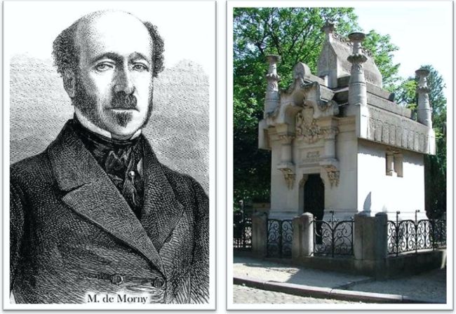 ... Charles-Auguste de Morny (1811-1865) Charles Auguste Louis Joseph de Morny naît à Paris le 17 septembre 1811. L'acte d'État civil rédigé pour l'occasion est un faux. Le véritable père est Charles de Flahaut, général d'Empire, brillant officier de l'État-major impérial et fils naturel de Talleyrand. La mère, la reine Hortense, fille d'Alexandre vicomte de Beauharnais et de Joséphine Tascher de la Pagerie, qui a épousé en secondes noces Napoléon Bonaparte. Hortence a épousé Louis Bonaparte (jeune frère de Napoléon l'a fait roi de Hollande). Elle lui donnera plusieurs enfants dont Louis Napoléon, futur Napoléon III. Élevé par sa grand-mère paternelle, la comtesse de Souza, Charles Auguste effectue ses études au collège Bourbon avant d'embrasser très tôt la carrière militaire. Fait Comte par Louis-Philippe en 1830, il entre à l'École d'état-major, en sort deux ans plus tard avec le grade de sous-lieutenant, et rejoint le 1er régiment de lanciers en garnison à Clermont-Ferrand, puis à Fontainebleau avant de servir en Algérie. Il participe ainsi à l'aventure coloniale. Après une action d'éclat au siège de Constantine en 1837, Morny est fait chevalier de la Légion d'honneur. En octobre 1837, il assiste à Rueil, aux côtés de son père, à l'inhumation de la reine Hortense, décédée le 5 octobre dans sa propriété d'Arenenberg, en Suisse, au sud du lac de Constance. Quelques mois plus tard, officier d'ordonnance du général Oudinot, il donne sa démission pour raisons de santé et rentre en France. Charles-Auguste de Morny décide alors de se lancer dans la politique. Élu le 9 juillet 1842 (il a trente et un ans) député du Puy-de-Dôme, il se montre favorable à la Monarchie de Juillet. Il apparaît à l'époque comme le type même du grand bourgeois libéral dévoué à l'orléanisme. Affairiste de talent, Morny a fait l'acquisition en 1838 d'une Sucrière près de Clermont-Ferrand. Sa maîtresse, Fanny Le Hon, héritière d'une riche famille d'hommes d'affaires belges, favorise son ascension qui se poursuit dans les années qui suivent. A la Chambre des députés, Morny soutient la politique conservatrice du ministère de François Guizot. Il fait bientôt figure de futur ministre, mais les événements de la rue en décident autrement. Le 22 février 1848, l'interdiction d'une manifestation provoque une émeute dans la capitale. Le surlendemain, le palais des Tuileries est pris d'assaut. Louis-Philippe doit abdiquer. Un gouvernement provisoire dominé par le poète Lamartine proclame la République. Une Assemblée constituante, élue le 23 avril et composée de républicains modérés, est chargée de rédiger une constitution, promulguée le 4 novembre 1848. Morny est réélu l'année suivante, le 13 mai, à l'assemblée législative. Sous la Seconde République naissante, il est désormais l'un des représentants du Parti de l'Ordre, aux côtés d'Adolphe Thiers, qui rassemble nombre d'anciens élus du régime déchu. Ruiné par la révolution de février, Morny est à cette époque poursuivi par les créanciers. A Londres, auprès de son père le plus souvent, il cherche à vendre sa collection de tableaux afin d'honorer ses dettes. Ses indemnités de parlementaire sont saisies. Peu soucieux du destin des Orléans qui, selon lui, avaient failli, il songe à passer au légitimisme, avant de faire la connaissance de son demi-frère, Louis-Napoléon Bonaparte. Morny avait soutenu ce dernier dans sa candidature à la présidence de la République, le considérant comme le meilleur rempart face aux risques révolutionnaires. L'élection de son parent est une chance qu'il doit saisir et les deux hommes se rencontrent pour la première fois à l'Élysée, au mois de janvier 1849. Dès le printemps suivant, Morny devient le principal conseiller de Louis-Napoléon, président de la République. Il invite en particulier ce dernier à ne pas reculer dans son opposition avec la Chambre et même à organiser un coup de force qui lui donnerait enfin les pleins pouvoirs. Le comte de Morny (vers 1850) et la chapelle où il repose au cimetière du Père Lachaise. Portrait gravé par T.G. Fath, d'après une photographie de Nadar. — La chapelle est due à Viollet-le-duc. Morny participe activement au coup d'État qui préside à l'avènement du Second Empire. Après une réunion des conjurés au soir du 1er décembre 1851, à l'Élysée, Morny s'empare du ministère de l'Intérieur, le 2 décembre au matin, jour anniversaire du sacre de Napoléon Ier et de la victoire d'Austerlitz. Après une période de calme dans la capitale, il gagne la bataille de la rue dans la journée du 4 décembre suivant, face aux barricades érigées et défendues par les opposants républicains et socialistes. La préparation du plébiscite des 21 et 22 décembre et des élections législatives de 1852 lui permettent de montrer à nouveau son efficacité. Morny instaure à cette occasion le système des candidatures officielles, repris par son successeur Victor de Persigny, recommandant aux préfets le choix d'hommes nouveaux, se démarquant de la classe politique et issus du monde des entrepreneurs (tels qu'Alphonse Pallu). Persigny se chargera d'organiser la répression et l'exil des proscrits. Morny démissionne du ministère de l'Intérieur le 23 janvier 1852, opposé au décret sur la confiscation des biens de la famille d'Orléans. Son départ fait grand bruit. Morny refuse alors une ambassade et un siège au Sénat. Il devient au Corps Législatif le 29 février, après sa réélection au siège de député du Puy-de-Dôme. Il devient président du Corps Législatif le 14 novembre 1854, et le restera jusqu'à sa mort. Morny occupe également le poste-clé de membre du conseil privé, éventuel conseil de régence créé le 1er février 1858. Homme de pouvoir sous le Second Empire, il se montre favorable à la modernisation du système économique et favorise notammen