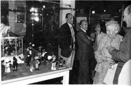 M. le Maire, Alain Jonemann, admire la reconstitution du kiosque, dont les personnages ont été réalisés d'après des documents d'époque par Mme Bourson.