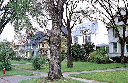 Riverside, IL, USA. Depuis la création, en 1831, beaucoup de parcelles ont été divisées notamment au cours de la crise des années 30. Un règlement d’urbanisme exige désormais qu’une parcelle ait au moins 16 m (50 pieds) sur rue.