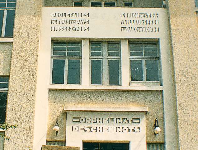Foyer du Vésinet. Inscriptions de la façade (1931-1987). Après sa fermeture, le bâtiment changea d'affectation et les inscriptions, qui avaient suscité des commentaires très partagés au Vésinet, ont désormais disparu. **** Notes et sources : [1] L'Orphelinat National des Chemins de Fer avait son Siège au 19, rue Pierre-Sémard, Paris (9e) [2] Propriété située entre Melan et les Mureaux, achetée en 1911 et tournant décisif de l'activité de l'Orphelinat National. Le Château a subi de nombreuses transformations pour l'adapter aux besoins d'un orphelinat. Les produits de la ferme, du verger, du jardin potager ou de la basse-cour permettaient d'assurer aux enfants une nourriture saine et abondante. Selon des principes éducatifs laïques, l'établissement possédait son école de 3 classes, dépendant du Ministère de l'Education Nationale, et permettant aux enfants d'accéder au C.E.P. L'établissement sera fermé en 1985. [3] L'établissement de La Bouzarea sera cédé aux cheminots algériens en 1962, à la fin de la guerre d’Algérie. [4] En 1987, Le bâtiment fut repris par l'Œuvre des Apprentis d'Auteuil qui en a fait une école où certains de ses pensionnaires sont scolarisés, l'École Pier Giorgio Frassati (2015). [5] à partir de 1977, les militants participant au XIIe congrès « décidaient, avec lucidité et courage, le principe de la fermeture de [leurs] établissements dans le temps avec le souci de préserver l’avenir de l’association par la réorientation et le développement de notre politique de solidarité ».