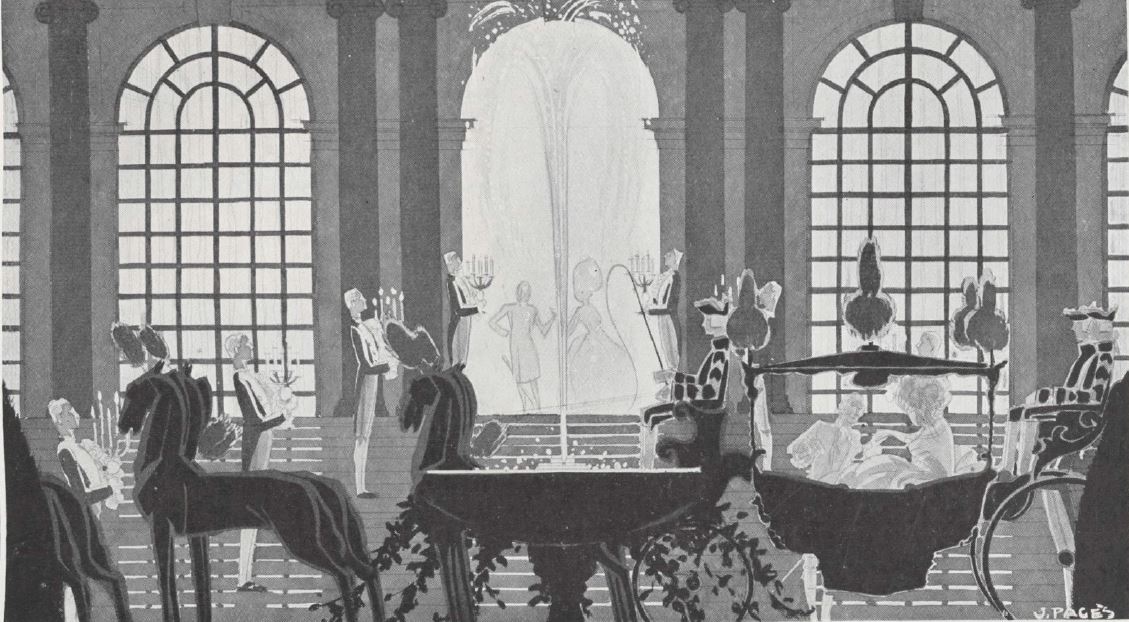 Vogue (Paris) vol. 8, n°9, 1er septembre 1927 Le Palais Rose en fête Dans les jardins décorés et éclairés suivant la tradition vénitienne au XVIIIe siècle, la Marquise Casati vient d'évoquer pour nous, avec une poésie infinie, le personnage étrange et magique de Cagliostro. Habillé d'or et d'argent, botté d'or, un masque d'or sur les yeux, la main droite posée sur sa longue épée, ce personnage fantastique, qu'il nous fut donné d'admirer dans cette soirée magique au Palais Rose, est évoqué par Drian [voir plus loin]. Il y eut aussi un défilé en carrosse, de la Reine Marie-Antoinette (la Vicomtesse Jean de Segonzac) et du Comte d'Artois (Pierre Meyer), puis l'arrivée tardive du serpent que quatre Egyptiens apportèrent, roulé au fond d'un sarcophage, — mais quand, pour le souper, on rentra dans les salons, on put crier son admiration au serpent de jais noir qu'était la Duchesse de Gramont, née Ruspoli ; on put voir et féliciter le Doge Mocenigo, en habit (le Comte de Beaumont) promenant sa robe de Doge.