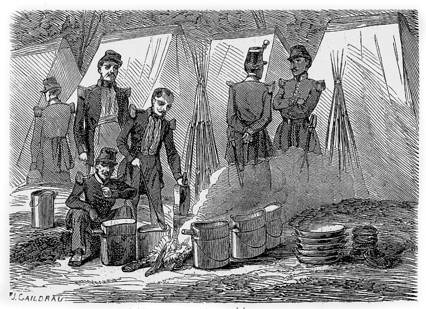 "En quelques minutes les feux sont allumés, et peu d'instants après la soupe bout dans les marmites, et il semblerait que nos soldats sont déjà établis depuis plusieurs jours."