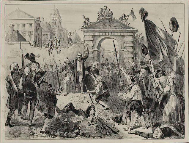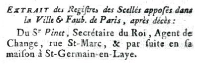 Dernière scène du « Pacte de Famine » joué pour la première fois au Théâtre de la Porte Saint-Martin, le 17 juin 1839. ...Devant la porte Saint-Martin, le peuple révolutionnaire se rassemble, brandissant piques et drapeaux... Affiche : Lithographie de Petit & Bertauts d'après E. Melingue. La mort suspecte et quelque peu mystérieuse de ce Pinet avait été mentionnée dans plusieurs brochures à visées promotionnelles ou touristiques pour évoquer le caractère « peu sûr » de l'ancienne forêt du Vésinet, mais toujours très succinctement. Labédollière est le premier à développer le contexte historique, probablement parce qu'il est remis à la mode par l'actualité littéraire et théâtrale du moment. Mais pour ce qui est de la personnalité de la victime, il ne fait que reproduire les allégations avancées un siècle plus tôt. Il s'agit de François Louis PINET (1750-1789) dont la mort fut rapportée le 2 août 1789 à Paris [8]. Né à Paris, fils et petit fils de tabletiers attachés à la Cour de Versailles, il était devenu un des 60 agents de change de la place de Paris. Il était en association avec Dominique Le Blanc (son beau-frère, le mari de sa soeur), avocat et banquier de la Cour, qui sera le tuteur de ses enfants. Pinet avait sa maison de change à Paris, rue St-Marc et une succursale à Saint-Germain-en-Laye. La presse parisienne mentionna « après décès » leur fermeture le 9 août 1789 et annoncera leur banqueroute quelques jours plus tard. Si cette banqueroute fit grand bruit à ce moment et eut, par son ampleur, des conséquences dramatiques pour les souscripteurs, le lien avec le Pacte de Famine n'apparaîtra que beaucoup plus tard.