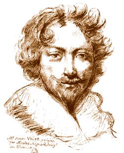 D'après Légendes de Trianon, Versailles et Saint-Germain (4e éd.) par Mme Julie Lavergne (1823-1886) [1] Pique-nique au XVIIe siècle dans le bois du Vésinet L'histoire se passe dans les dernières années du règne de Louis XIII. ...Louis XIII était alors à Fontainebleau, où il chassait. La Reine faisait une retraite au Val-de-Grâce, pour se préparer aux fêtes de la Toussaint. Les enfants de France étaient restés au château neuf de Saint-Germain, sous la garde de leur gouvernante, Madame la maréchale de la Motte-Houdancourt. . Simon Vouët (1590-1649) Tout en chantant, en causant et en mangeant des chasselas de Fontainebleau, les voyageurs passèrent le pont de Neuilly, Nanterre, traversèrent la Seine dans le bac de Chatou, et arrivèrent un peu avant midi sous les chênes géants de la forêt du Vésinet, appelée alors la forêt d'Echauffour. Madame Vouët avait décidé que l'on y dînerait, près du carrefour de la Trahison. C'était à cet endroit de la forêt, disaient les légendes, que Ganelon et ses complices avaient juré de trahir Roland, et qu'au retour de la guerre d'Espagne, l'empereur Charlemagne avait fait brûler vifs les fauteurs de la mort de Roland. Certes, ce n'étaient pas là de bonnes raisons pour dîner en cet endroit maudit, et Eustache Lesueur [3] en fit timidement l'observation.