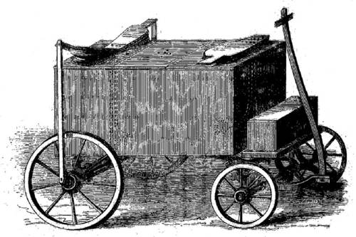 La rotation des roues de derrière la voiture met en mouvement, par deux petits excentriques, deux soufflets qui alimentent d'air l'eau pendant la marche. A l'avant de la voiture se trouve un autre soufflet à main que le conducteur fait marcher toutes les fois que la marche est suspendue. Les tuyères de ces soufflets pénétraient jusqu'au fond du compartiment où elles étaient terminées par des pommes d'arrosoir qui, en divisant la colonne d'air, évitaient les soubresauts brusques du liquide. Cette petite voiture, qui a servi à acheminer des Truites dans les étangs du Vésinet près de Paris, est demeurée au Jardin d'acclimatation où on la garde comme un des appareils qui, un jour venu, ornera le Musée de la pisciculture, en rappelant ses premiers efforts (3).
