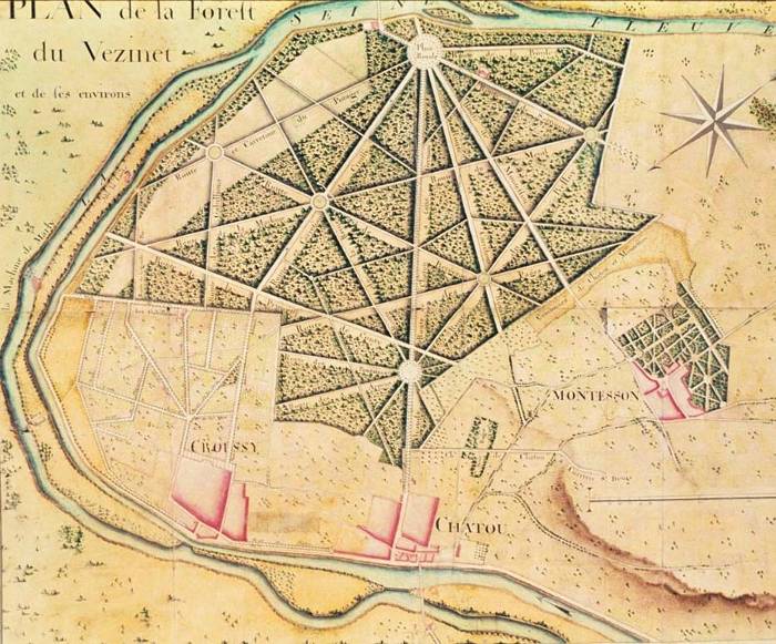 Les routes forestières du XVIIIe siècle et ce qu'elles sont devenues aujourd'hui. Place Royale (rond-point de la République et tout ce qu'englobe aujourd'hui la rue Circulaire) Route de La Borde (route de Sartrouville). Route de Sartrouville (route de la Passerelle et rue des Merlettes), où se trouvait la "maison du Garde". Route de Montesson (idem). Route Royale (avenues Médéric et du Grand-Veneur) ; Carrefour Royal (Rond-point Royal ou du Cerf). Grande route de Chatou à St Germain (boulevard Carnot); carrefour de Chatou (av du Belloy / bd Carnot / bd des Etats Unis). Route de Croissy (idem); carrefour de Croissy (disparu) grande étoile, comparable au rond point du Cerf, qui serait à peu près à l'intersection allée de la Gare / rte de Croissy. Route du Potager (disparue); carrefour du Potager (disparu) sur les communes du Pecq ( av. Pierre Curie) et de Croissy (disparue). Route du Mesnil (disparue) et route de la Machine (disparue), grand axe nord-sud allant à peu près de l'entrée du stade des Merlettes jusqu'à la Seine à Croissy. Route de Bergerac (avenue Horace Vernet), qui se poursuivait jusqu'à la Seine, via le carrefour de Croissy. Route de la Reine (disparue), grand axe nord-est / sud-ouest passant par le Carrefour de Chatou et le Carrefour de Croissy. Route de la Princesse de Conty (avenues du Général de Gaulle et de la Princesse), elle allait jusqu'à la Seine. Il semble que ce plan soit le premier à représenter cette voie. Route des Pages (avenue des Pages); elle suivait son tracé actuel des limites de Chatou jusqu'au carrefour royal, puis se poursuivait dans le même axe jusqu'à Croissy. Route du Belloy (avenue du Belloy). Les routes des Fontaines, des 4 arpens, des Gabillons, voies en partie sur le territoire des communes voisines qui ont disparu au Vésinet. Plusieurs chemins de traverse sont aussi représentés mais sans indication de noms. On en retrouve le tracé dans l'avenue des Courlis ou l'Allée d'Isly par exemple.