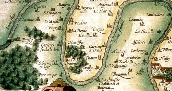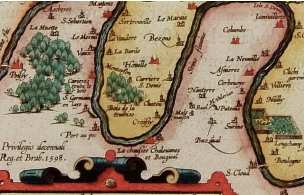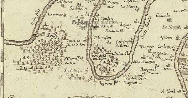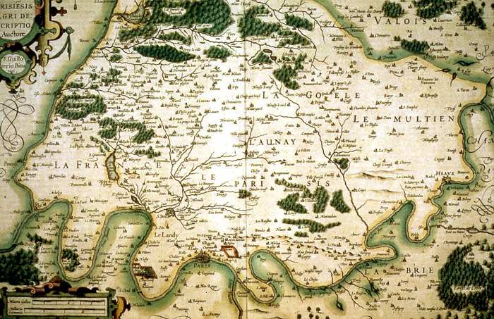 Pierre Pithou (1598) d'après la Guillotière, Ager parisiensis vulgo l’Isle de France , Fr. Guilloterius bitur viu. describ. et Cl.V. Petro Pithæo I.C. dedicabat carte de 52 x 40 cm, noir et blanc, Paris, 1598.