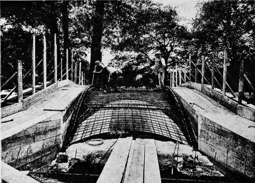 Dans les ponts en arcs de faible portée, par analogie avec ce qui se passe dans les ponts en maçonnerie, on se borne généralement à remplir d'un remblai les reins de la voûte. Ici, comme la résistance aux poussées était réalisée au moyen de deux arcs de rives, on a constitué le hourdis sous chaussée, de part et d'autre du voûtain de clé, par deux voûtains dont les génératrices étaient parallèles à l'axe de la chaussée et dont la section transversale présentait une flèche de 20 cm.