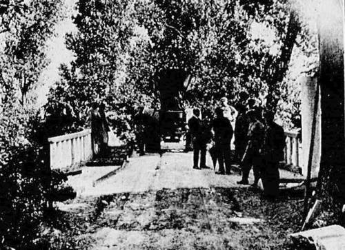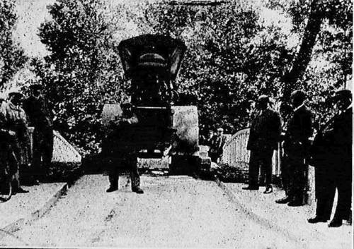 La dernière des épreuves a consisté à grouper sur la clé du pont le rouleau et les 8 tonnes de fonte occupant ensemble l'empattement du rouleau soit 4 mètres de longueur environ.