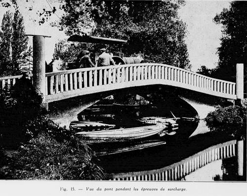 Les charges comprenaient une charge morte de 8 tonnes composée de 400 poids en fonte de 20 kg qui a été répartie sur les trottoirs à raison de 400 kg par m², et le rouleau compresseur de 10 tonnes de Ville du Vésinet, qu'on a fait passer à plusieurs reprises sur l'ouvrage. La dernière des épreuves a consisté à grouper sur la clé du pont le rouleau et les 8 tonnes de fonte occupant ensemble l'empattement du rouleau soit 4 mètres de longueur environ.