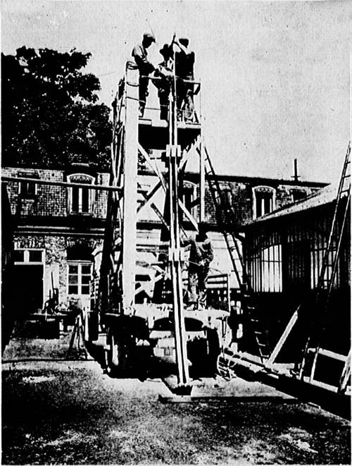 Du haut de l'échafaudage, on a versé successivement dans chaque tube des pelletées de béton gâché très clair, introduites dans les tubes au moyen d'un entonnoir.