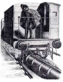 Chemin de fer atmosphérique en marche. On notera la position très exposée du garde-frein en tête de train. Le conducteur garde-frein Lacotte, qui occupait cette position fut une des victimes de l'accident du 6 septembre 1858.