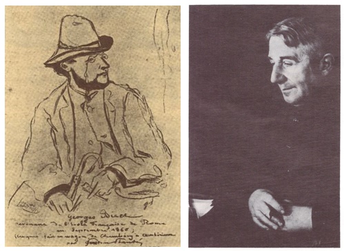 A gauche, Georges Bizet [4]. A droite Emile Chartier dit Alain En 1917, juste après sa démobilisation, Emile Chartier, plus connu sous le pseudonyme d'Alain, acheta une petite maison où il vint passer plusieurs jours par semaine. En 1933, à l'âge de 65 ans, il abandonna son cours de philosophie au lycée Henri-IV et s’établit définitivement au Vésinet, écrivant, recevant ses amis (Paul Valéry, André Maurois) ; il y demeura jusqu'à sa mort en 1951. Notes de la revue: [*]Présenté comme le Jules Verne du crayon dans un article de la revue Fiction, septembre 1954, p. 114. [**]Cf. Le Vésinet, revue municipale, n°63 p. 41. [***] C'était au 26, rue Alphonse-Pallu. **** Notes et sources SHV: [1] Si cet article a été le point de départ de nombreuses recherches de la SHV, il compte ici une erreur. Le célèbre librettiste, qui a été confondu avec un résident d'origine néerlandaise, du nom de Alfred Henri de Plunkett, négociant. [2] Il s'agit d'Eugène Rudier, fils d'Alexis mort en 1897. Eugène Rudier a conservé la signature de son père comme une marque commerciale. [3] Cette date de 1940 est sans doute une coquille car Joséphine avait laissé de nombreux souvenirs au Vésinet, dès son arrivée en 1929. [4] Sur le dessin, on peut lire : Georges Bizet revenant de l'Ecole française de Rome en septembre 1860. (Croquis fait en wagon entre Chambéry à Ambérieux par Gaston Planté). [5] C'est l'année 1929. Bourdelle passera plusieurs mois au Vésinet, jusqu'à sa mort le 1er octobre.