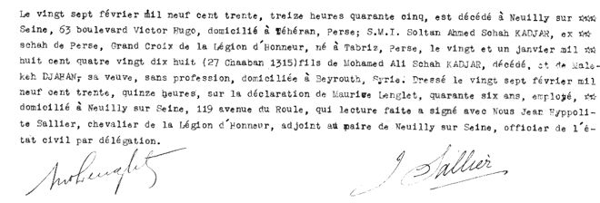 Le 27 février 1930 ... est décédé à Neuilly-sur-Seine, 63 boulevard Victor-Hugo, domicilié à Téhéran, Perse S.M.I. Soltan Ahmed Schah KADJAR, ex-shah de Perse ...