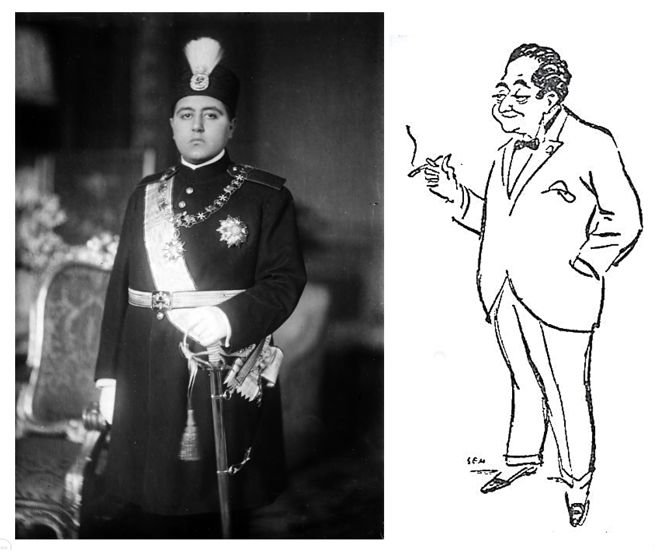 Ahmad Shah, portrait officiel (1923) et caricature par Sem du prince en exil (1925)