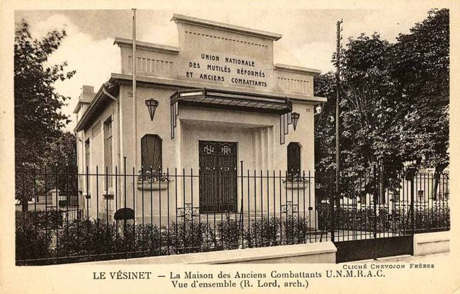 Exemple de plaques de l'architecte Roger Lord encore visibles sur de nombreuses maisons au Vésinet (shv, 2013) Au cours de cette période, plus d'un millier de pavillons seront construits, le nombre de ménages comme celui des habitants ayant plus que doublé. [8] La concurrence est rude alors entre les architectes installés au Vésinet (Roger Lord, Lauthe & Colombey, Pierre Durvelle, Paul Michon, Théo Clément, Raymond Génoni, Raoul Oddos ...) et d'autres venus des alentours, à commencer par la famille Deyres, Louis, le père et Camille le fils (né au Vésinet) exerçant à Croissy, auteurs d'une dizaine de pavillons. On peut citer aussi : André Burckart (St Germain) ; Charles Pithois, (St Germain) ; Maurice Rosier (St Germain) ; Antonin Tamburin (St Germain) ; Raymond Lacombe (St Germain et Bagneux) ; Georges Godin (Chatou) ; Bourgeois père et fils (Poissy) ; Maurice Hout (Asnières) ; Albert-Adrien Grand (Marly-le-Roi) ; Maurice Ouvré (Enghien-les-Bains) ; Auguste Oradour (Bécon) ; Jean-Henri Maque (Le Raincy) ; René-Paul Richet, (Ermont) ; Pierre Allard (Paris) ; Blandin-Voirgard (Paris) ; Robert Bourin & René Hartwig (Paris) ; Emile Choltus (Paris) ; René Clozier (Paris) ; Henri Logut (Paris) ; André Delhoume (Paris) ; Jean Demaizière (Paris) ; Thomas Harvey (Paris) ; Jean Lacau (Paris) ; Charles Legroux (Paris) ; Alexandre Nortier & Louis Vernayre (Paris) ; Petit & Bapaz (Paris) ; Albert & Maurice Turin (Paris) ; Édouard Weiler (Paris) ; etc. L'usage courant dans la première moitié du XXe siècle, des plaques d'architectes, facilite cette énumération qui n'est pas exhaustive. Parmi ces villas et pavillons « signés » s'élèvent aussi de nombreux exemples de maisons « vendues sur catalogue » avec de nombreuses offres de crédit, par des sociétés plus ou moins renommées (Entreprise Générale de Constructions, Les Chaumières, Les Pavillons de France, Pavillons et Villas modernes, Salvat, La Familiale foncière, etc.). En 1929, Roger Lord est choisi pour l'édification de la Maison du Combattant, un projet de l'Union Nationale des Mutilés Réformés (UNMR), la première du genre en France. Le bâtiment sera élevé sur un terrain voisin de la gare du Vésinet (centre) appartenant à la compagnie des Chemins de fer de l'Ouest. La première pierre est posée solennellement le 11 novembre 1929. Le lieu sera déclaré d'utilité publique dès le 29 novembre 1929, avant même son achèvement.