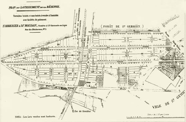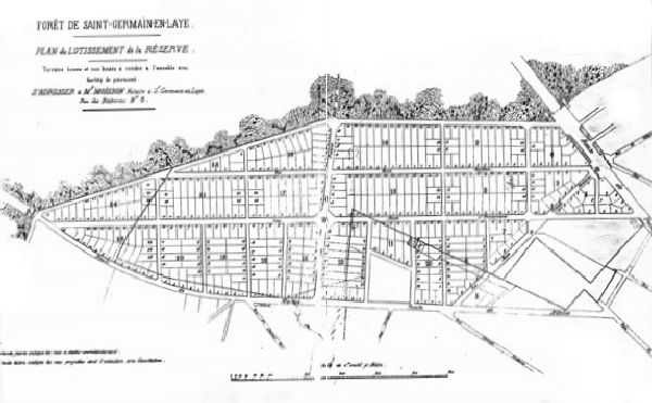 ... La Réserve-Péreire, à St-Germain-en-Laye Dans l'échange conclu le 20 novembre 1856 entre la Maison de l'Empereur et la Compagnie Pallu, cette dernière recevait, outre le territoire du Vésinet, une (petite) portion de la Forêt de Saint-Germain (voir ci- dessous, alinéa 2°). (Extrait de l'acte d'Echange, en date du 20 novembre 1856) ... le dit échange consistant, savoir, de la part de S.E. le Ministre de la Maison de l'Empereur agissant pour le domaine de la Couronne: 1°. Dans la forêt du Vésinet, située sur les communes de Chatou, du Pecq et de Croissy, arrondissement de Versailles et trois maisons forestières existant dans cette forêt, laquelle est d'une contenance totale actuelle de quatre cent trente six hectares, cinquante ares, quarante six centiares environ. 2°. Dans une portion à prendre au sud de la forêt de Saint Germain située sur la commune de Saint-Germain-en-Laye, d'une contenance de quarante neuf hectares, deux ares, soixante deux centiares, maison d'habitation du Garde forestier et du Garde général, contre-allée extérieure longeant le mur de clôture du côté de la route de Poissy et le fossé séparant cette contre-allée de la route. 3°. Dans la concession faite pour l'usage de la forêt du Vésinet d'une quantité de deux cents mètres cubes d'eau (deux mille hectolitres), par vingt-quatre heures, gratuitement pendant les trois premières années et ensuite au prix ordinaire des concessions de cette nature, et pour l'usage de la portion de la forêt de Saint Germain d'une quantité de quatre cents hectolitres d'eau par vingt-quatre heures à prendre dans la partie des eaux de la ville de Saint Germain appartenant à la liste Civile, et ce à perpétuité et à titre gratuit. Le 22 juillet 1858, Société Pallu & Cie (la seconde société, fondée le 14 juin précédent) cédait à la société d'Emile Péreire cette portion de forêt de quarante neuf hectares dite la Réserve. L'opération immobilière qui s'en suivit, un projet de lotissement, fit l'objet d'un cahier des charges mais celui-ci n'avait pas la même ambition que celui imposé aux acquéreurs du Vésinet. A St Germain, il précisait que les acquéreurs des parcelles du lotissement devront dans un délai de un an du jour de l'acte de vente faire édifier une maison à usage d'habitation bourgeoise ou de commerce.