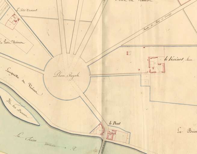 Le Pecq [Cote 3P 2/177/04] Cadastre napoléonien, 1820, Section du Vesinet (98cm x 68cm); échelle 1/2500e Une version complète "haute définition" (environ 2Mo) peut être téléchargée sur le site des Archives départementales. Voir aussi les plans de Chatou, Croissy et Montesson.