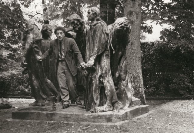posant dans la sculpture Les Bourgeois de Calais de Rodin.