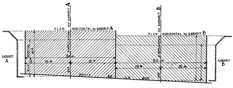 Figure 10: Dans la 4e catégorie, exemple d'application des gabarits dans une rue en pente de 12 m 00 de largeur. Société d'Histoire du Vésinet, 2004 www.histoire-vesinet.org |