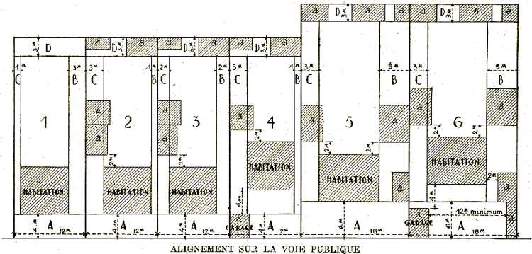 Figure 2: Six exemples d’utilisation des terrains dans les 3 premières catégories. 1, 2, 3, 4. Terrains de 3e catégorie. 5, 6. Terrains de 2e catégorie. A. Zone non aedificandi en façade sur rue. B, C. Zone non aedificandi le long des lignes mitoyennes. D. Zone non aedificandi le long de la ligne mitoyenne du fond de la propriété. a. Exemple des petites constructions autorisées par les articles 5, 6, 7, 8. Nota. Il devra toujours exister une