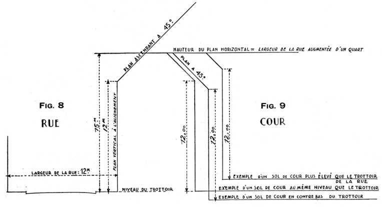| Figures 8 et 9: Gabarit sur rue et Gabarits sur cour Exemple des gabarits sur rue et sur cour appliqués à une construction ayant à la fois façade sur rue et façade sur cour. Ces gabarits sont applicables aux constructions édifiées sur les terrains appartenant à la 4e catégorie.