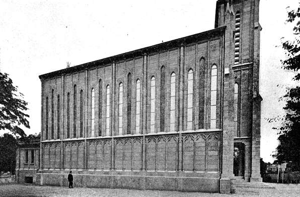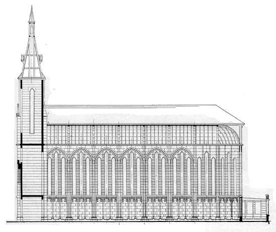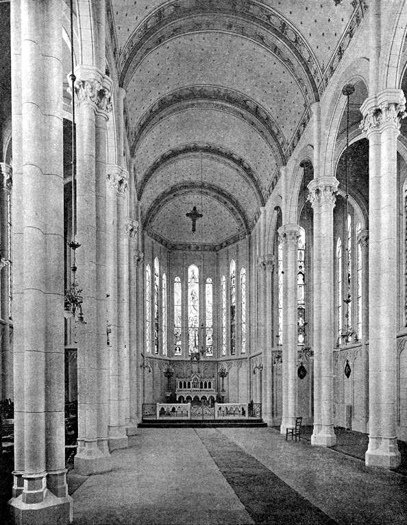 C'est ainsi que, dans le clocher, apparaît nettement la technique d'une construction qui revient à superposer des blocs préalablement moulés et rigoureusement goujonnés, les joints très avoués déterminant le volume de chaque élément. Ainsi en va-t-il dans le reste de cette façade principale et surtout dans les façades latérales où la technique collabore presque automatiquement, pourrait-on dire, à suggérer à l'architecte un heureux mode de décoration. En effet, par le simple agencement de meneaux et d'arcatures où, de bloc à bloc, peut exactement se préciser dans quelle proportion participent, à l'équilibre général, des éléments types, homogènes de matière et mécaniquement réalisés par une économique industrialisation, on peut arriver à se rendre compte que la proportion des baies ne pouvait être différente. Sans avoir jamais été commandé par son matériau, l'architecte, en la circonstance, s'est en quelque sorte appuyé sur lui, sur les qualités qu'il lui savait et sur les conditions de sa fabrication, pour aboutir à définir le style de son édifice. C'est là un fait capital et dont l'importance s'élève bien plus haut encore que la pointe du clocher de l'église Sainte-Pauline du Vésinet. [1] Don de Madame Adèle Chardron, en souvenir de son mari, Joseph Armand Chardron. Le nom de Pauline est celui de Pauline Chardron, leur fille, disparue en 1886, à l'âge de 20 ans.